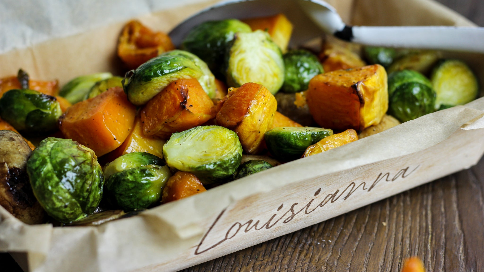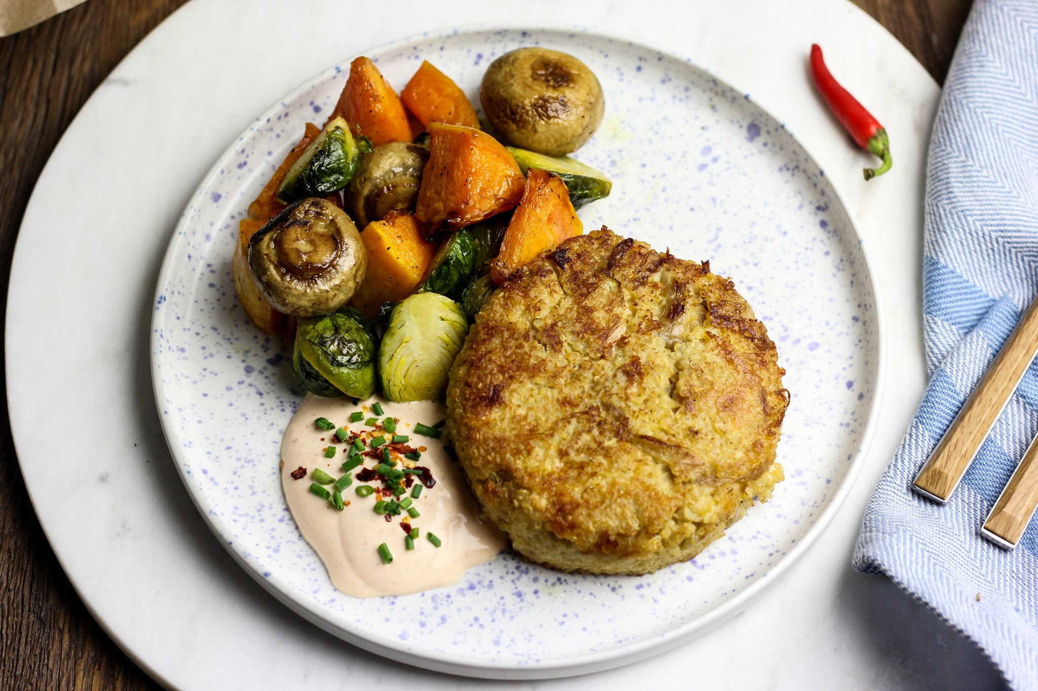 DE KLASSIEKER: Vegetarische quinoa-kaasburger van gekarameliseerde ui, cheddar en gruyère met gepofte pompoen, spruitjes, champignons en srirachadip (VEGGIE)